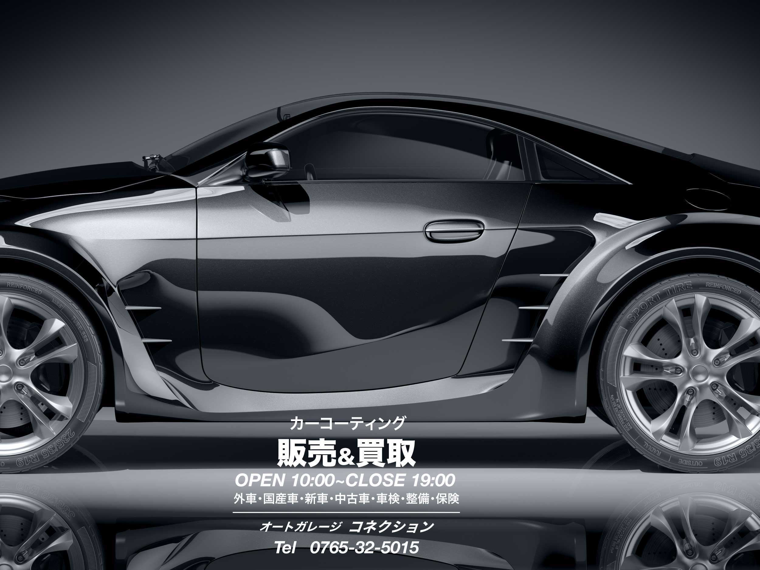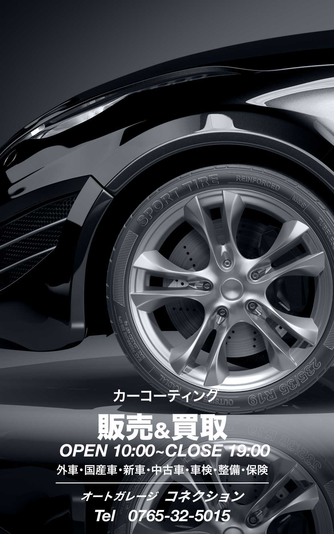 オートガレージ コネクション〒938-0801 黒部市荻生4124Tel 0765-32-5015 OPEN 10:00~CLOSE 19:00 Fax 0765-32-5016取 扱 品 目 外 車・国産車・新 車・中古車・カーコーティング・ 車検・修理・板金・塗装・保険・業務